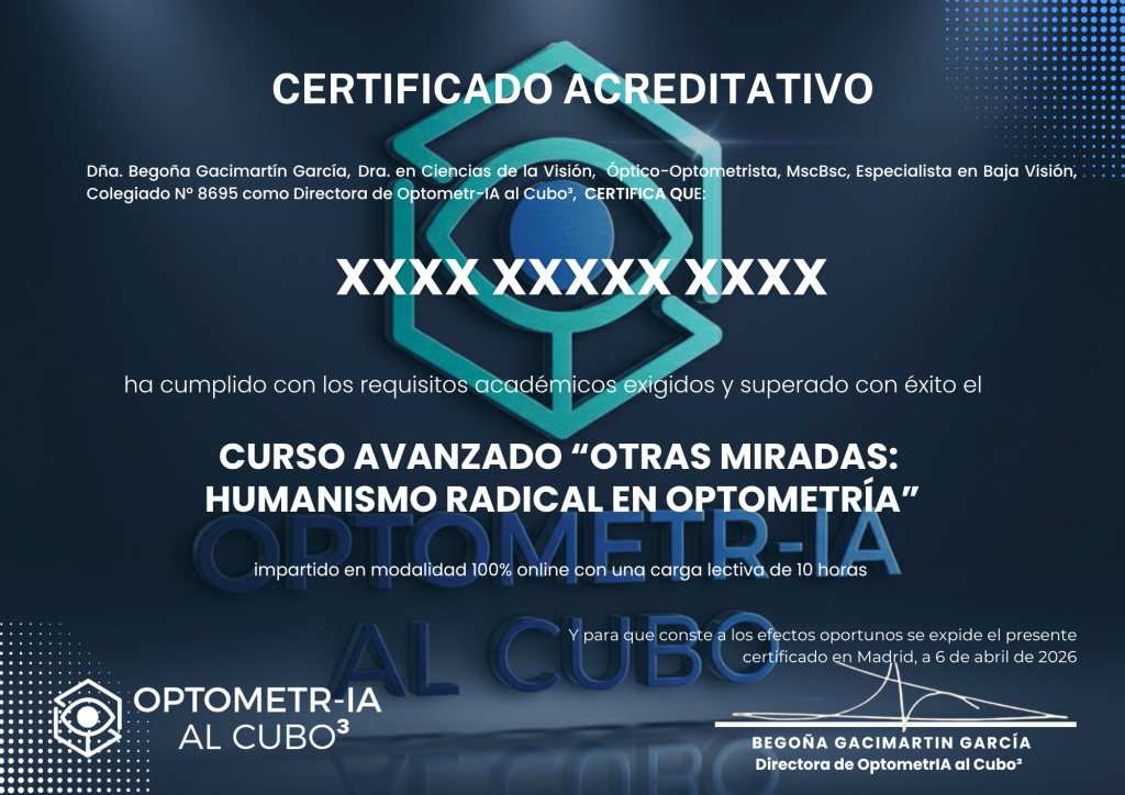 - A la finalización del Curso, todos los alumnos que hayan realizado con éxito el programa recibirán el Diploma Acreditativo otorgado por Optometr-IA al Cubo³